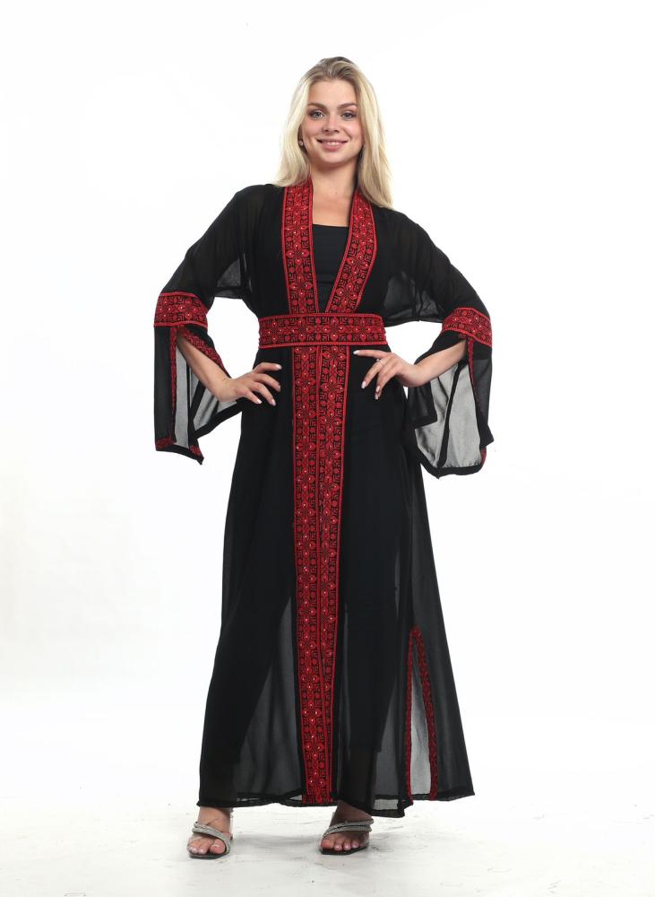 - الجزء الأمامي: يتميز بتطريز تقليدي فاخر يمتد بطول الجلابية من الياقة إلى الحافة السفلية. التطريز الأحمر الجريء يضفي لمسة من الجمال والأناقة على التصميم، بتفاصيل دقيقة تجمع بين التراث والحداثة. التصميم الأمامي المفتوح يجعل الجلابية مثالية للاستخدام مع فساتين داخلية، مما يمنحك مرونة في تنسيق إطلالاتك. كما أن الخطوط الطولية للتطريز تعزز من مظهر الطول وتمنح الإطلالة انسيابية وجاذبية.