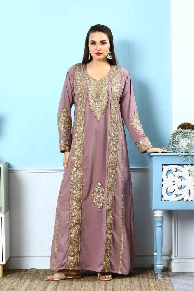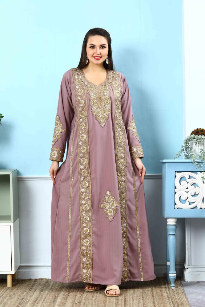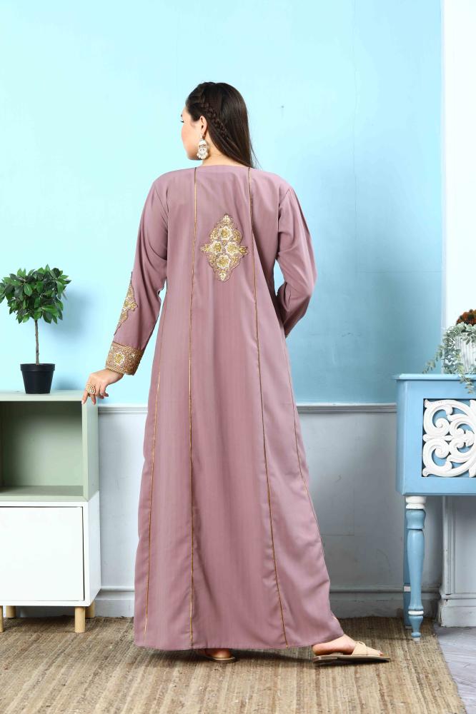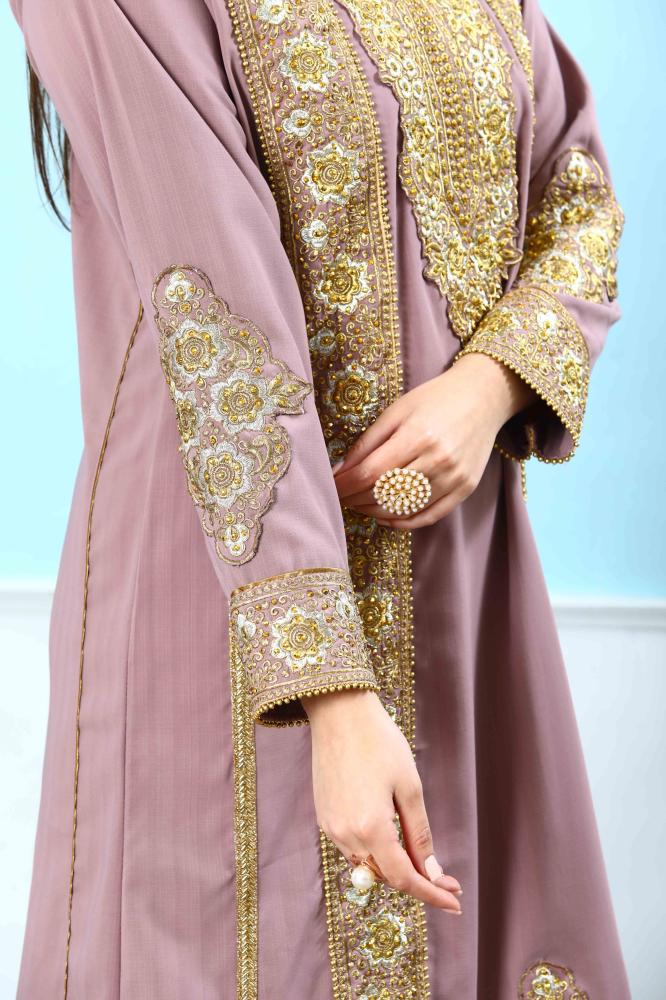 امنحي إطلالتك تميزًا لا يُضاهى مع هذه الجلابية الإماراتية باللون وردي الفاخرة التي تمزج بين التفاصيل التراثية والأناقة العصرية بتطريز كمبيوتر وفصوص ذهبية.