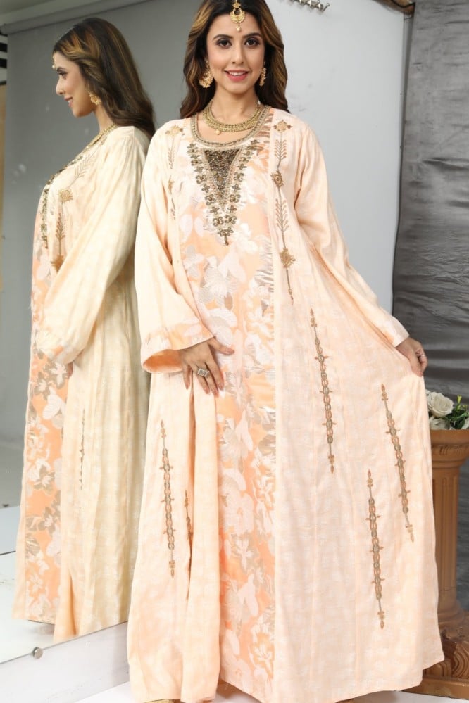استمتعي بالأناقة التي لا مثيل لها مع جلابية استقبال ناعمه لون برتقالي فاتح، المصنوعة من البوليستر الناعم الذي يوفر الراحة طوال اليوم