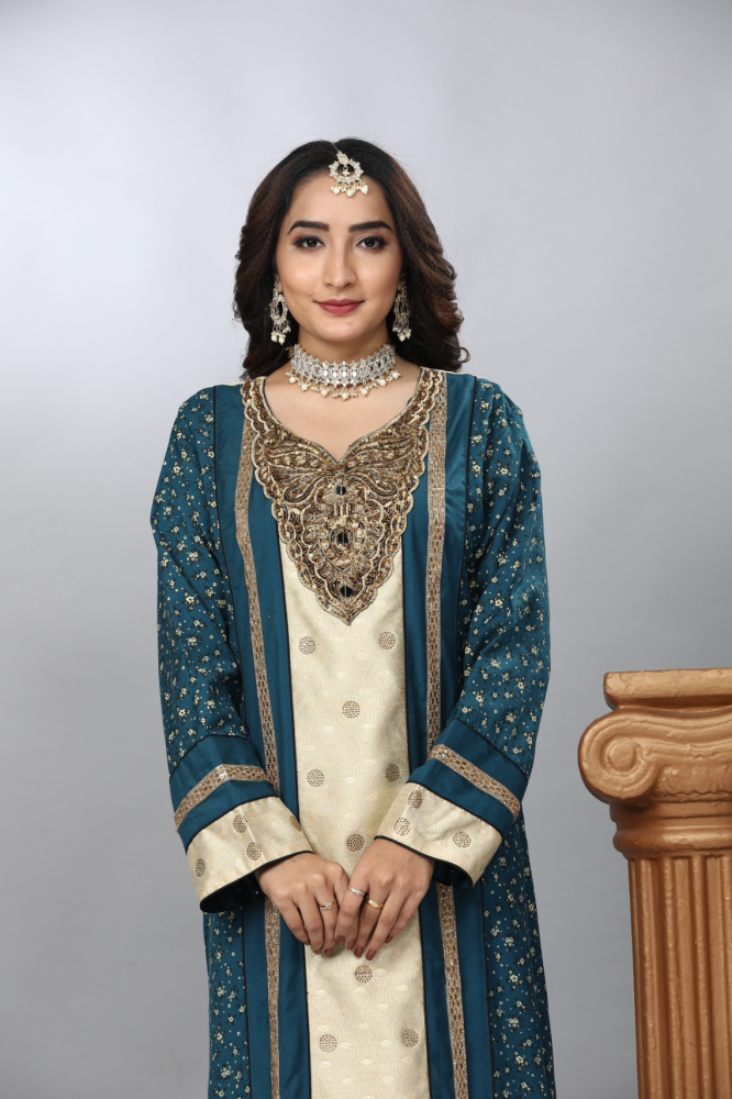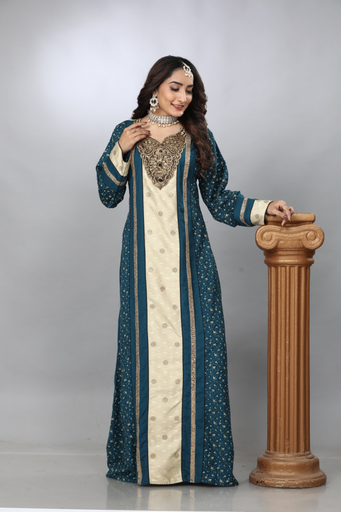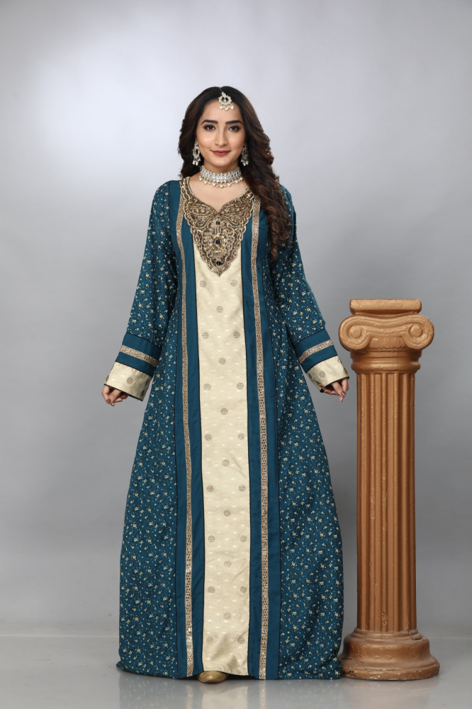 استمتعي بأناقة لا مثيل لها مع أرقى جلابية إستقبال باللون البترولي، المصنوعة من خليط البوليستر والقطن الناعم الذي يوفر الراحة طوال اليوم.