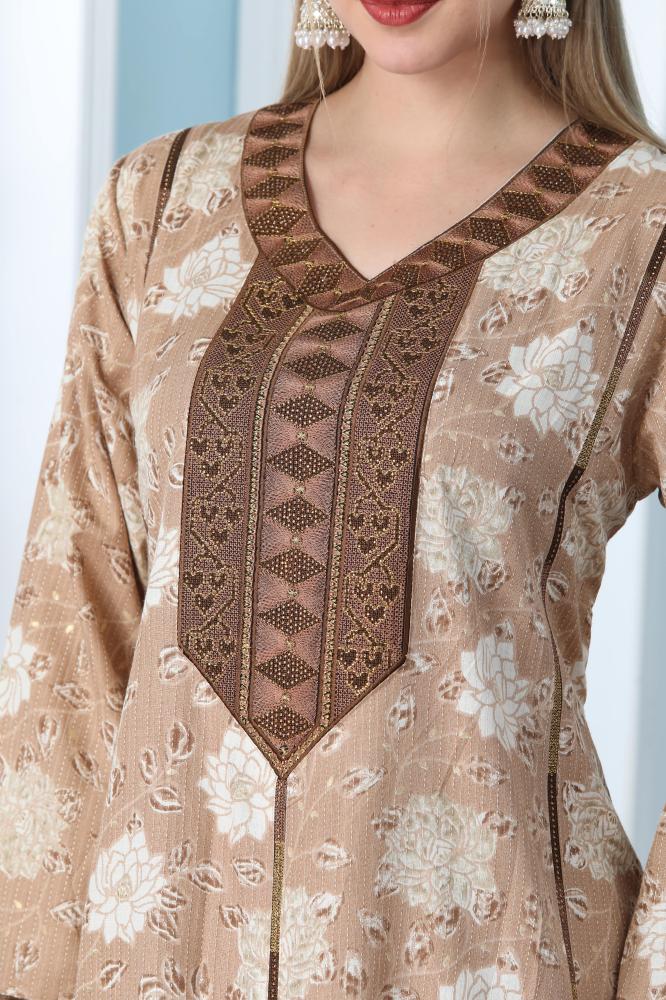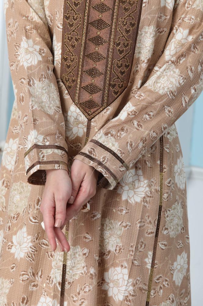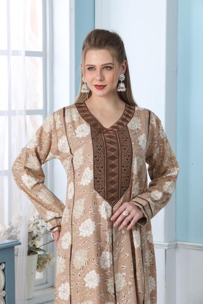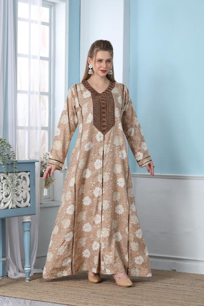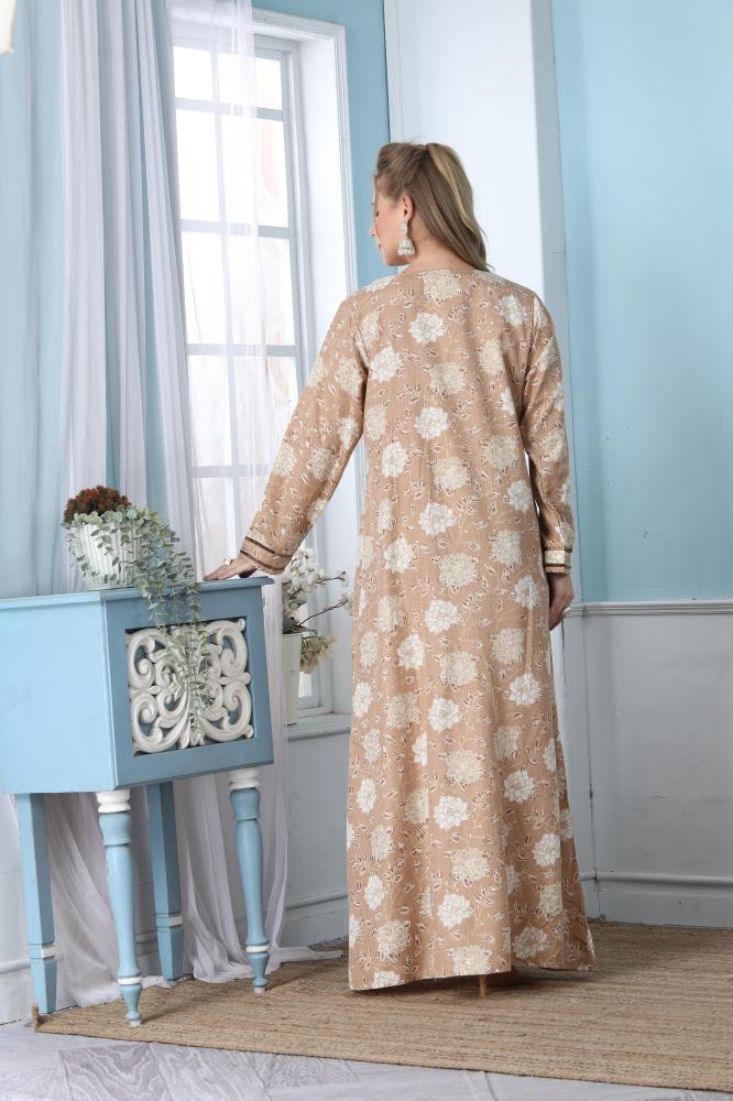 تألقي بأسلوب يجمع بين التراث البحريني العريق والتصاميم العصرية الفاخرة، مع هذه الجلابية البحريني باللون البني المصممة بدقة لتمنحك حضورًا أنيقًا ولافتًا.