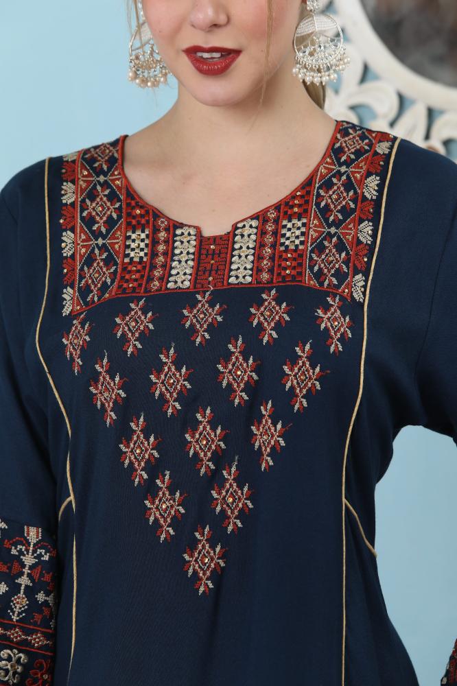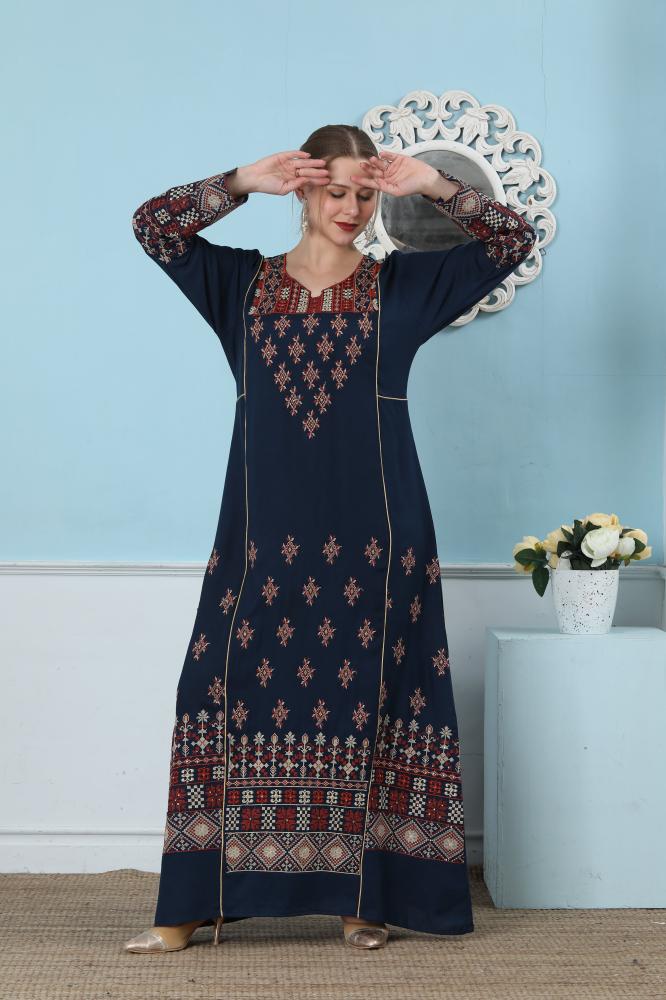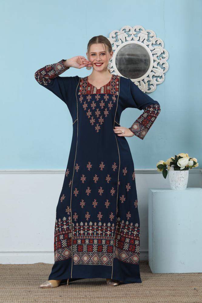 استلهمي أناقة التراث الأردني الفاخر مع هذه الجلابية الأردنية باللون الكحلي الفاخر و المصممة بعناية، حيث يجتمع التصميم التقليدي مع التفاصيل العصرية لتمنحكِ إطلالة استثنائية.