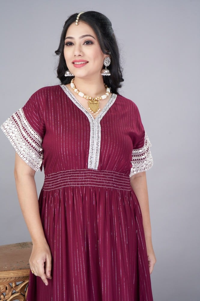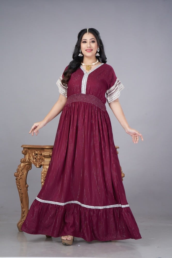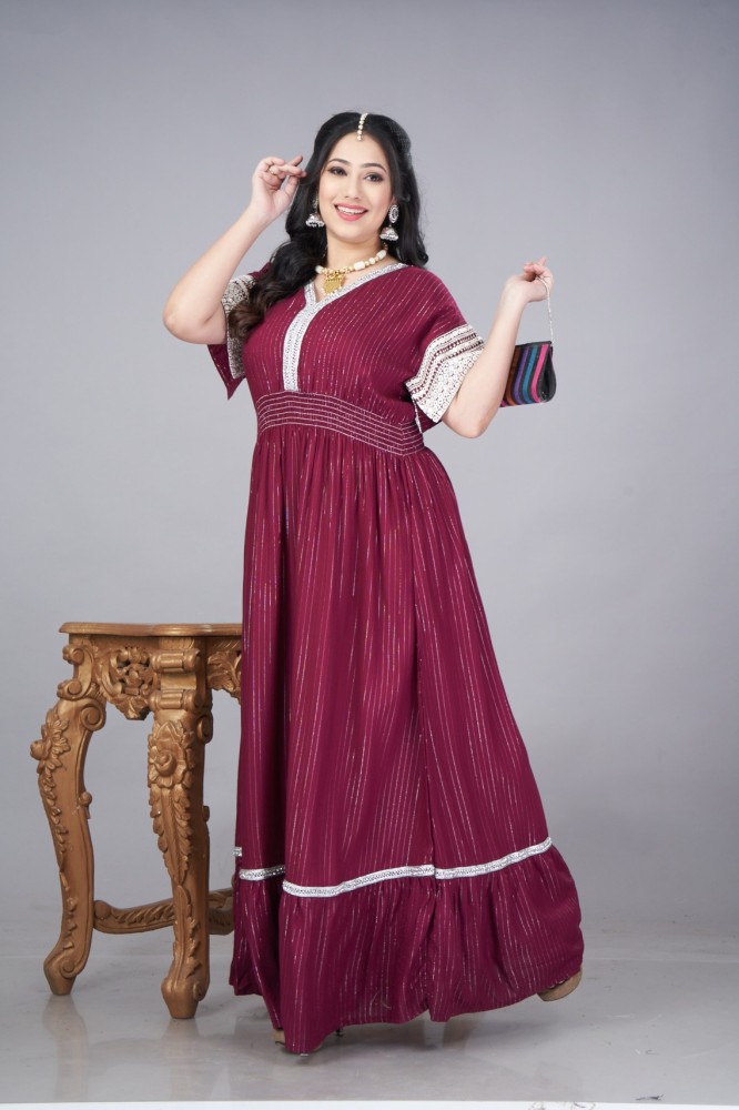 إطلالة فاخرة بلون عنابي مع تطريز فصوص أنيق يضفي لمسة من البريق والجمال، هذه الجلابية الكويتية مناسبة لكل مناسباتك المميزة.