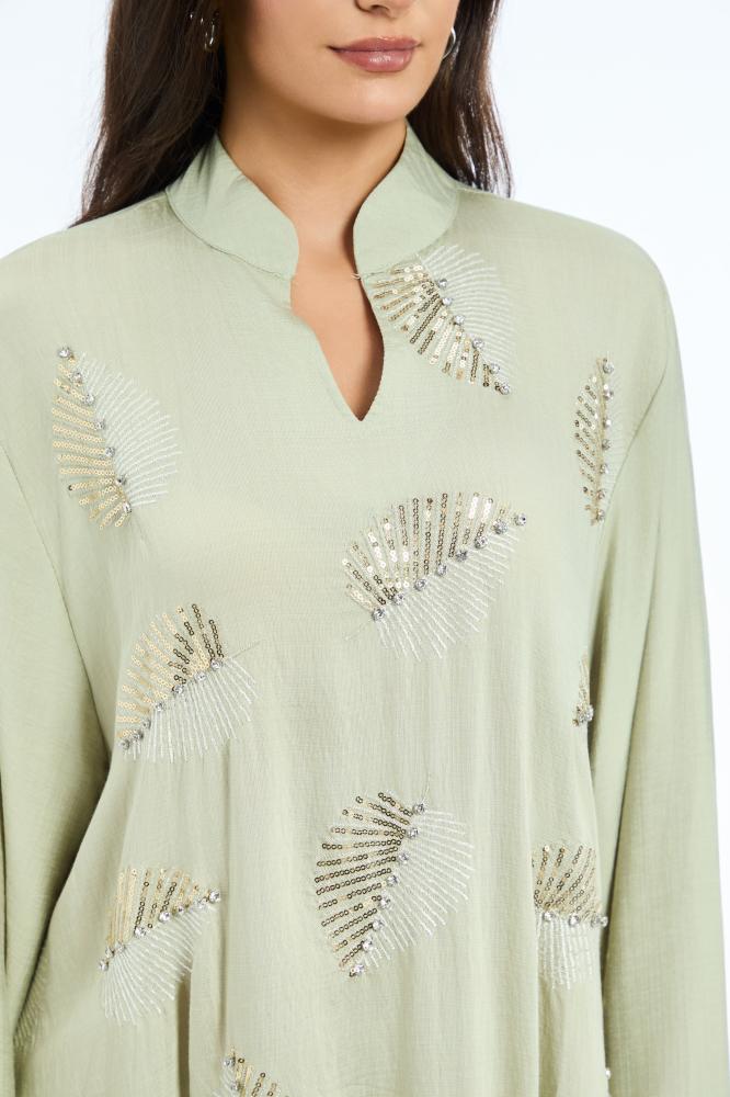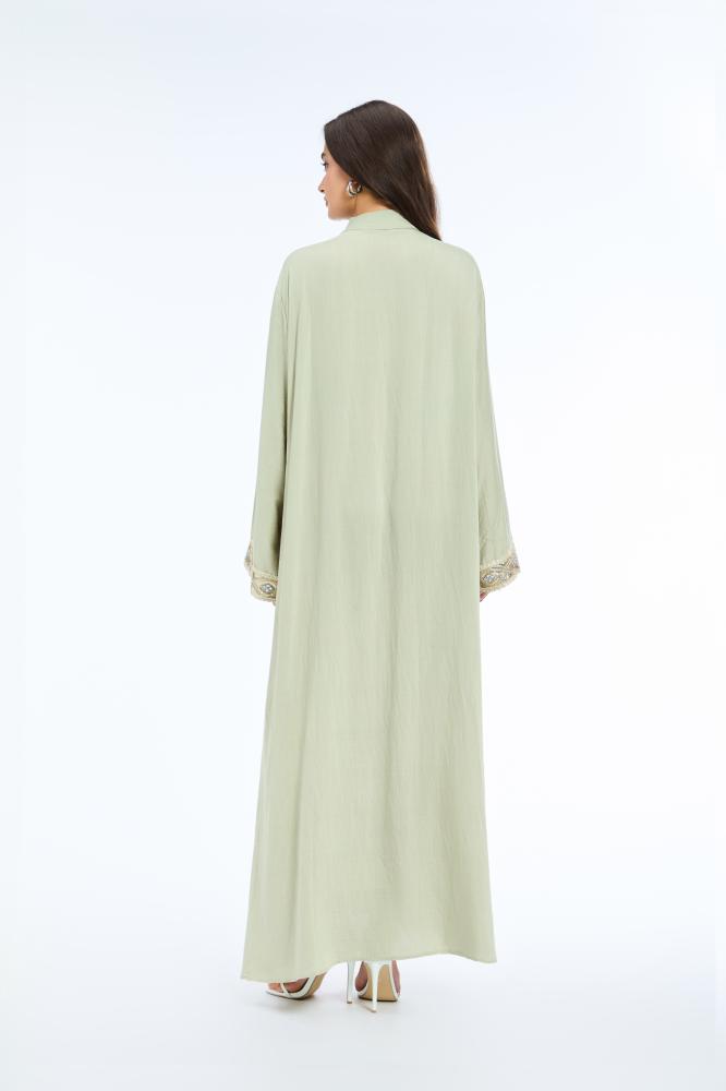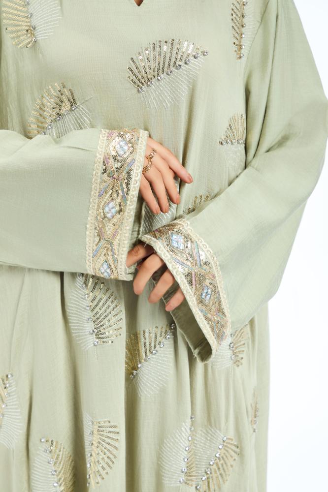 - الأكمام: مزينة بلمسات فاخرة من الفصوص والترتر مع خيط القصب، بالإضافة إلى تطريز هندسي على الحواف يبرز جمالها.