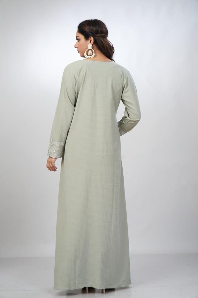 ارتقي بإطلالتك مع الجلابية الكويتي الناعمة باللون الأخضر بتطريز كمبيوتر المستوحاة من الذوق الأصيل، بتفاصيل مترفة تبرز جمالك بكل أناقة.