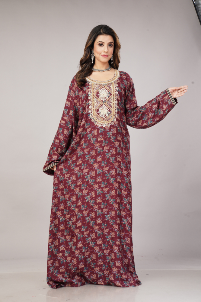 إستمتعي بالأناقة والراحه التي لا مثيل لها مع الجلابيه مقاس كبير لون عودي، المصنوعة من القطن الناعم والكشمير الذي يوفر الراحة طوال اليوم