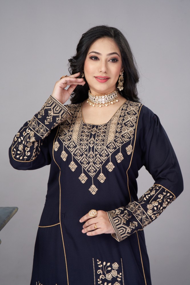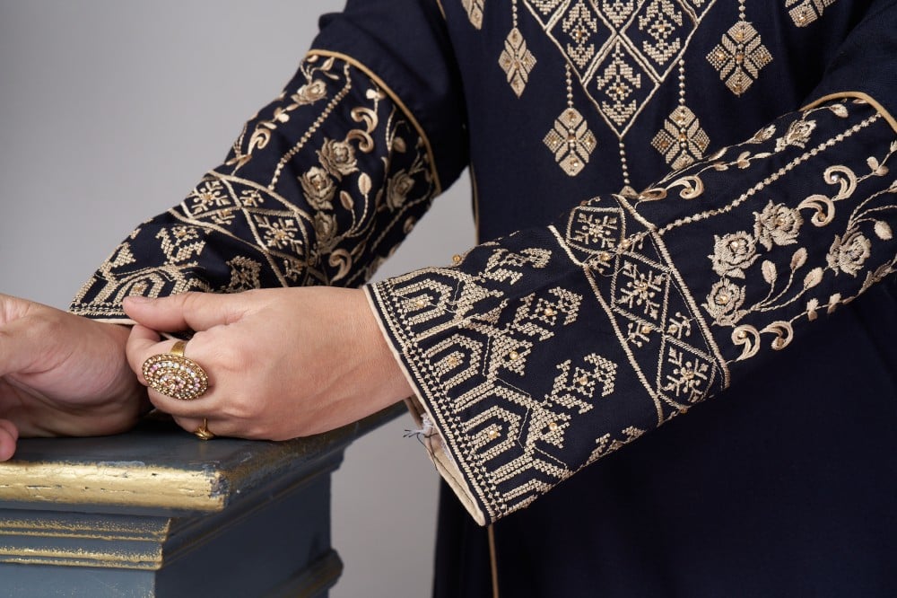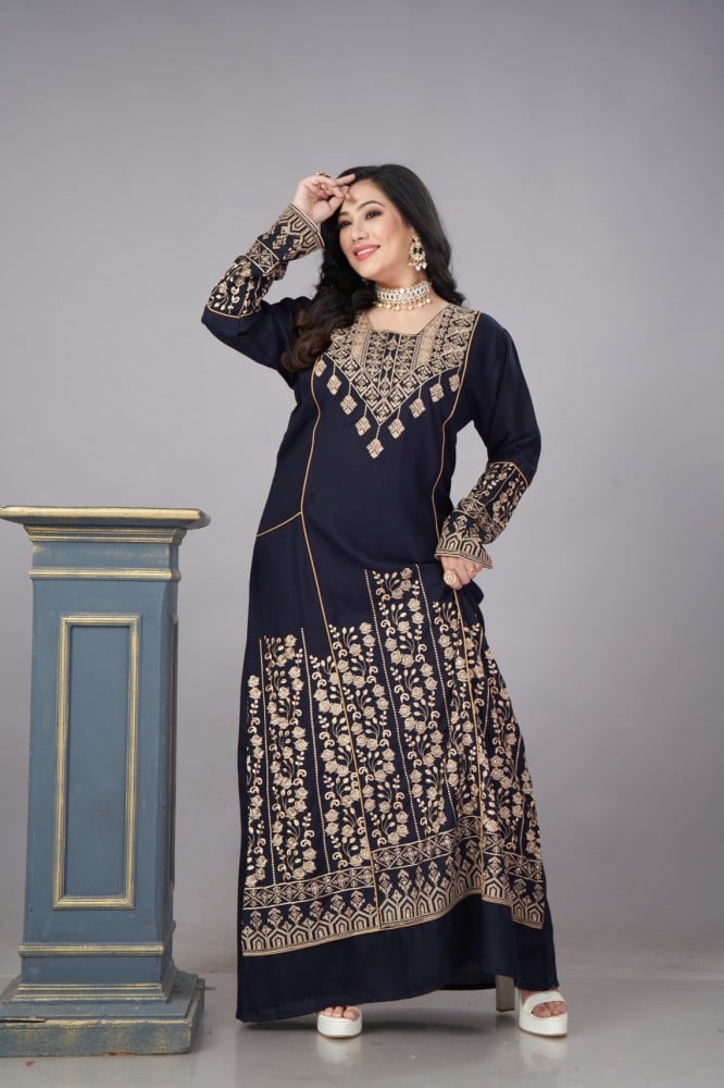 جلابية أنيقة مستوحاة من التراث الأردني باللون الكحلي الراقي. تضيف لمسة من الرقي والفخامة لإطلالتك، مثالية للمناسبات الاحتفالية والتجمعات العائلية.