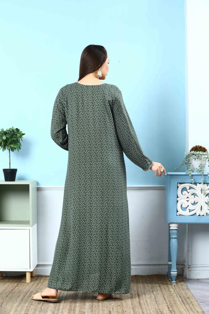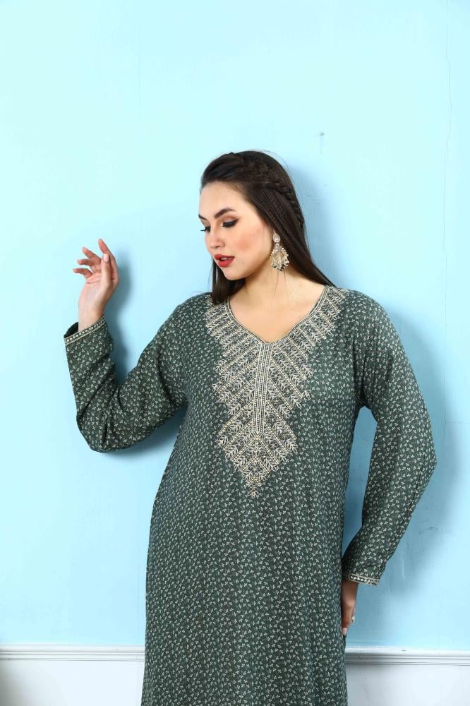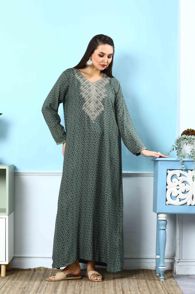 استمتعي بجمال التفاصيل الفاخرة مع هذه الجلابية الكشمير باللون الزيتي المصممة بأسلوب يجمع بين التراث والرقي، لتمنحك حضورًا أنيقًا يلفت الأنظار.