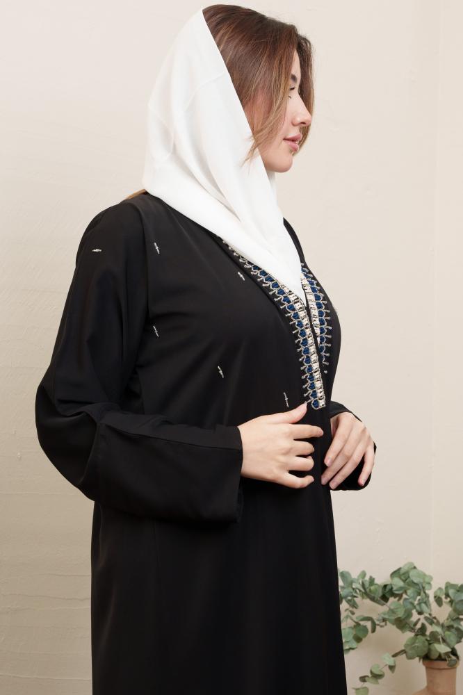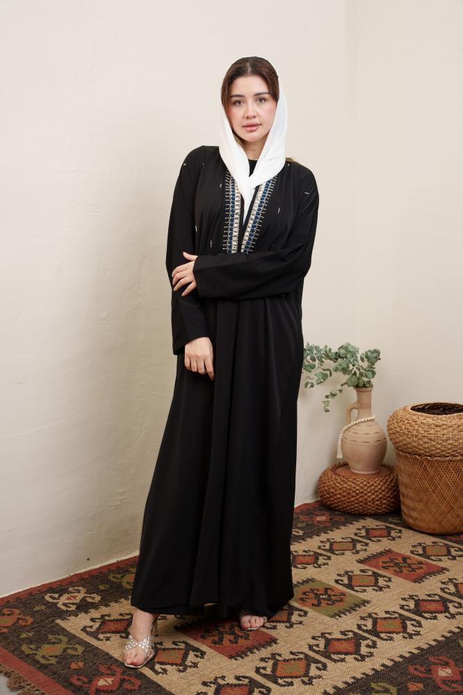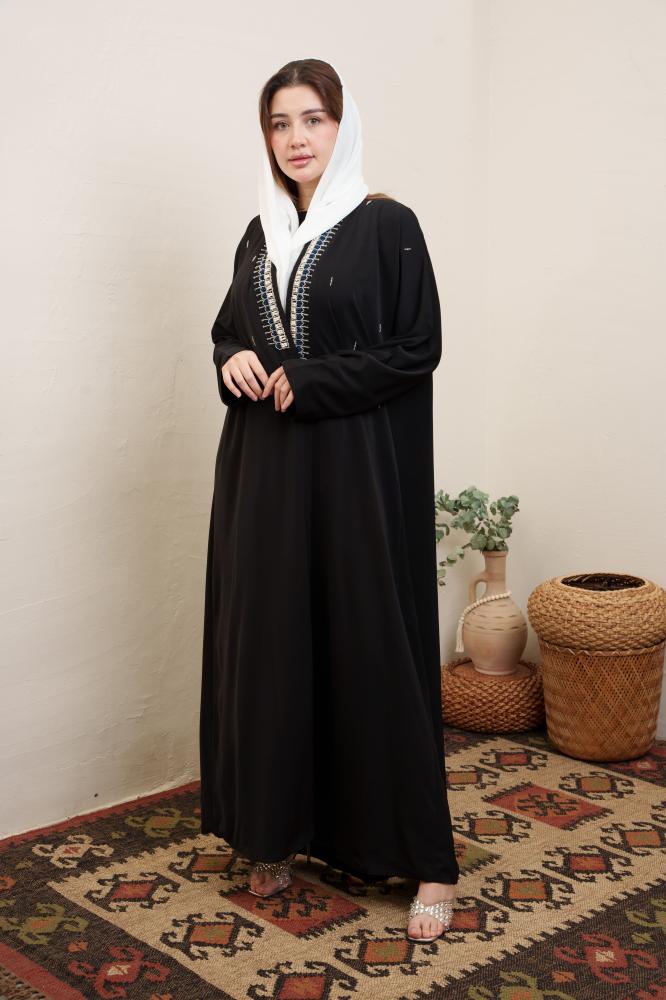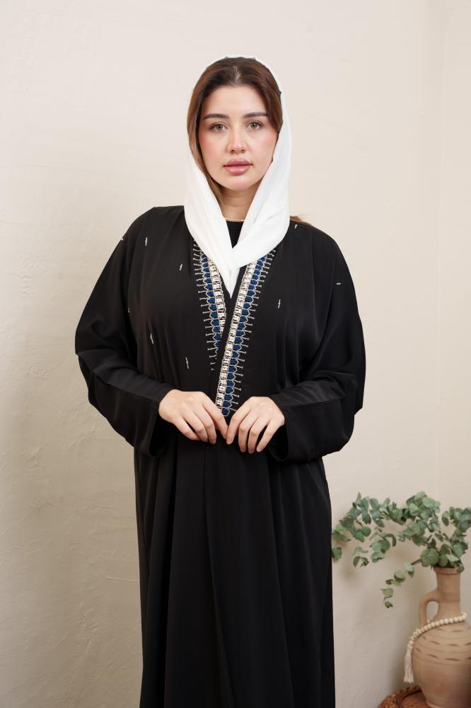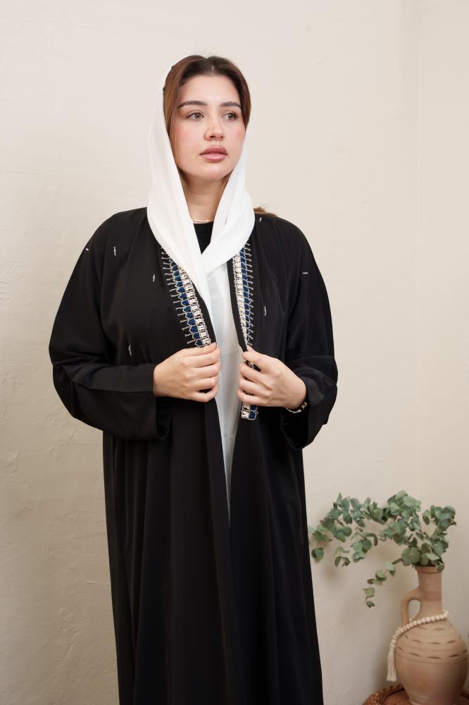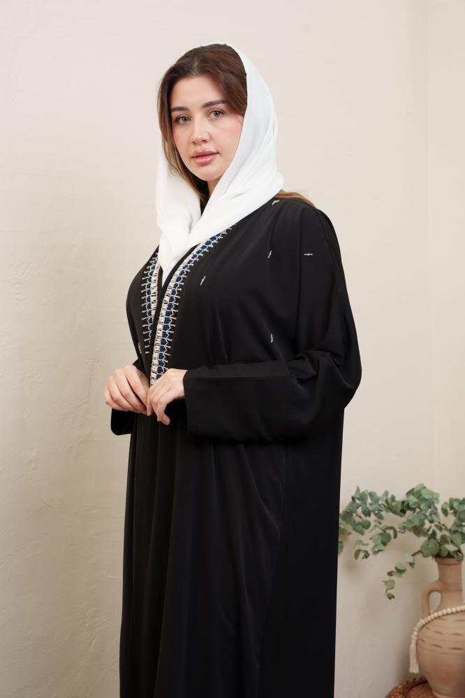 عباية مناسبات سوداء قماش كريب ناعم مشغول يدويًا بلف مع القطان، أنيق، مريح، ولمسة فاخرة تناسب مختلف التصاميم، مع طرحة متناسقة لإطلالة راقية ومتكاملة.