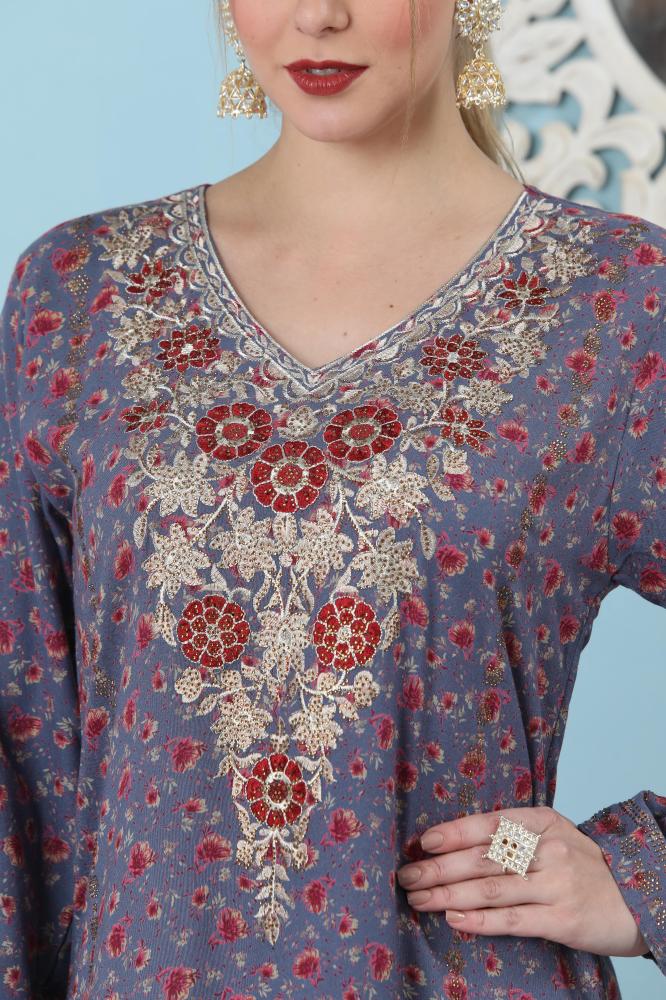 - الصدرية: مطرزة بتطريز كمبيوتر دقيق مع إضافة الفصوص البراقة لمظهر فاخر وجذاب.