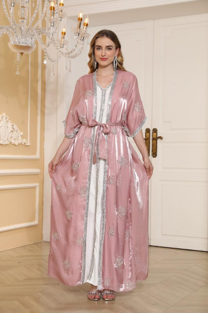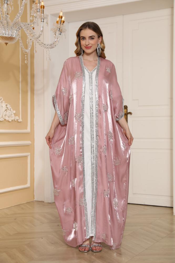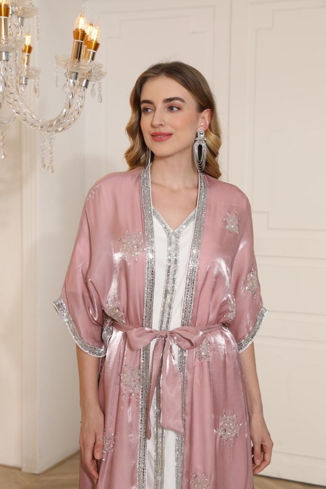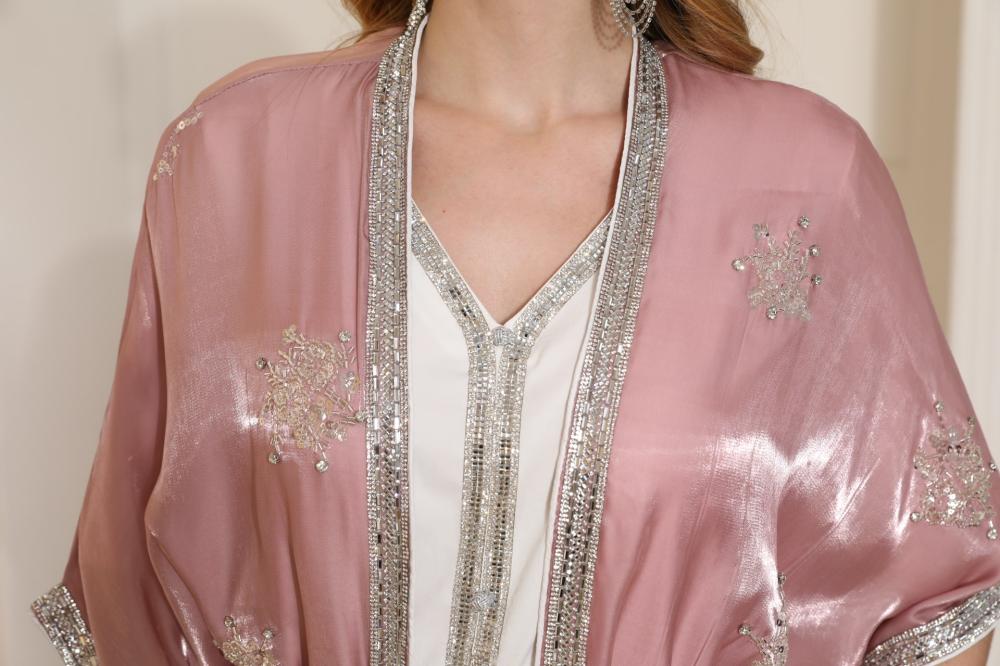 استمتعي بإطلالة ملكية تجمع بين الفخامة والأنوثة مع جلابية سهرة مميزة مكونة من قطعتين. القطعة الداخلية تأتي بلون أوف وايت أنيق بخطوط لامعة من اللس فضي تمنح لمسة بريق جذابة، أما القطعة الخارجية فهي مصنوعة من قماش الأورجانزا الفاخر باللون الوردي اللامع، مزينة بتطريزات دقيقة ومشغولة بخيوط وخرز فضي تضيف لمسة من الفخامة والرقي.