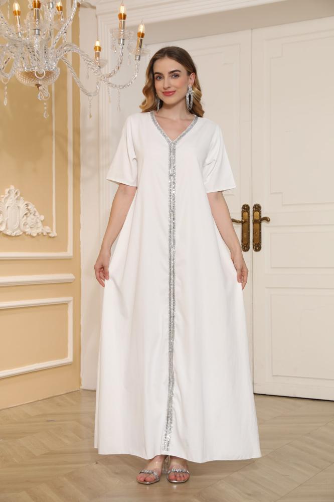 - القطعة الداخلية: جلابية أوف وايت بتطريز لامع من اللس فضي على طول الأمام والياقة.